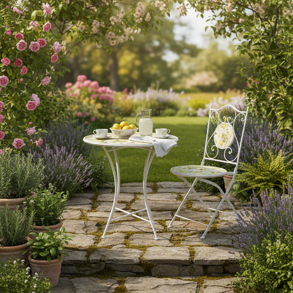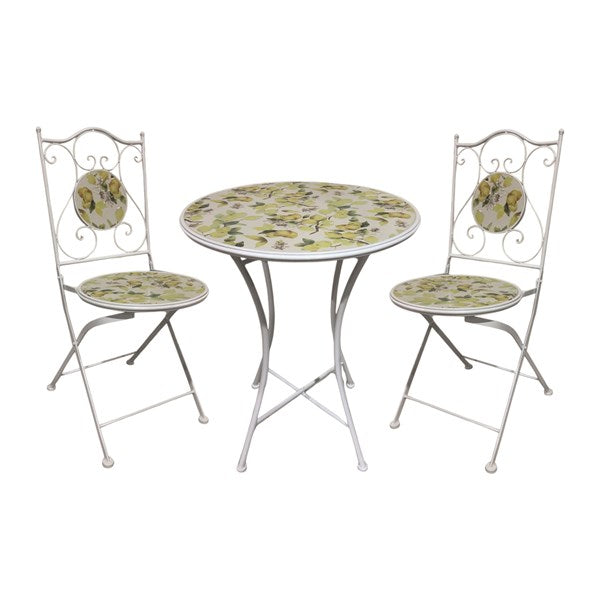 The Letino bistro set is a vibrant and eye-catching outdoor dining set, perfect for brin ging colour and character to your garden or patio. The set includes a circular table and two matching chairs; all finished with an intricate lemon design which makes the mosaic tiles stand out against the bright white frame — a combination that evokes a summer feel.
