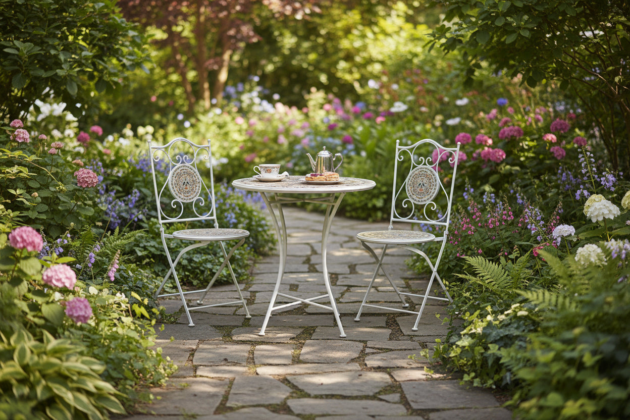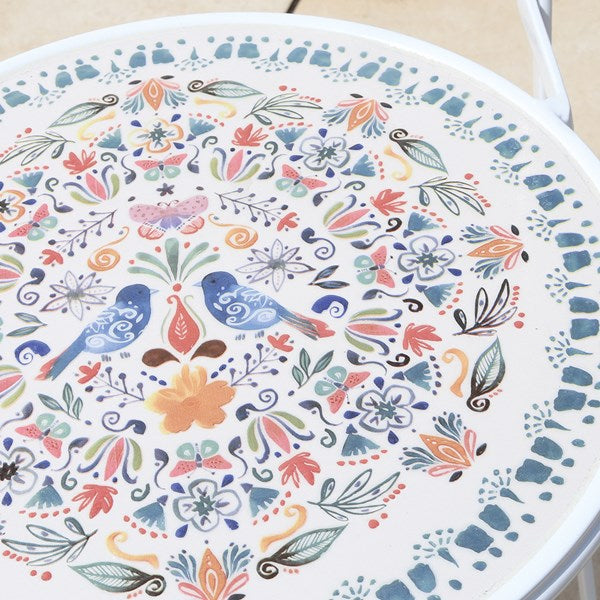 The Paraiso bistro set is a vibrant and eye-catching outdoor dining set, perfect for bringing colour and character to your garden or patio. The set includes a circular table and two matching chairs; all finished in a soft rainbow colour palette. The intricate bird and floral design make the mosaic tiles stand out against the bright white frame – a combination that evokes a Mediterranean feel.