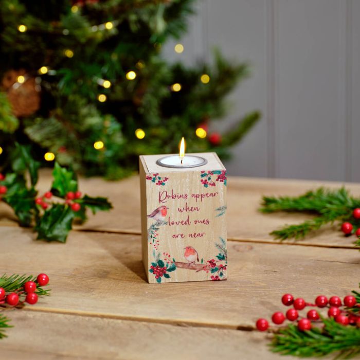 AvailableBring warmth and charm to your home with the Festive When Robins Appear Wood Tea Light Holder, perfect for creating a cosy and inviting atmosphere during the holiday season.
