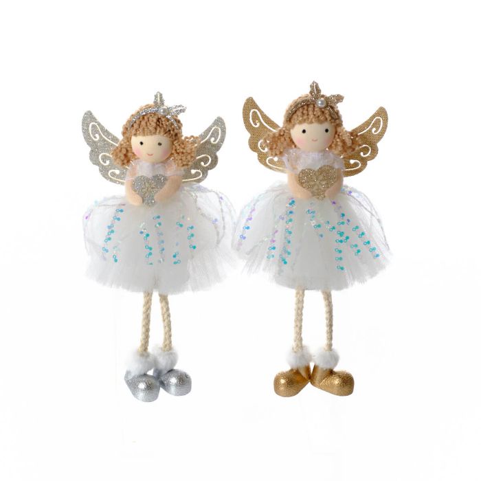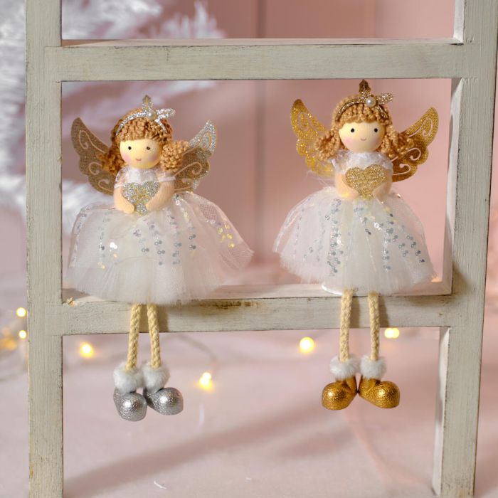 Add a magical touch to your holiday décor with these Christmas Fairies shelf sitters. Each fairy wears a delicate white tutu adorned with shimmering iridescent sequins and features sparkling gold or silver glitter wings. With braided hair, a decorative headband, and matching glitter shoes, they hold a glitter heart, bringing charm and festive sparkle to any shelf or mantel. Standing 18 cm tall, these fairies make enchanting seasonal decorations that capture the spirit of Christmas with elegance and whimsy. Perfect for creating a warm, joyful atmosphere in your home.