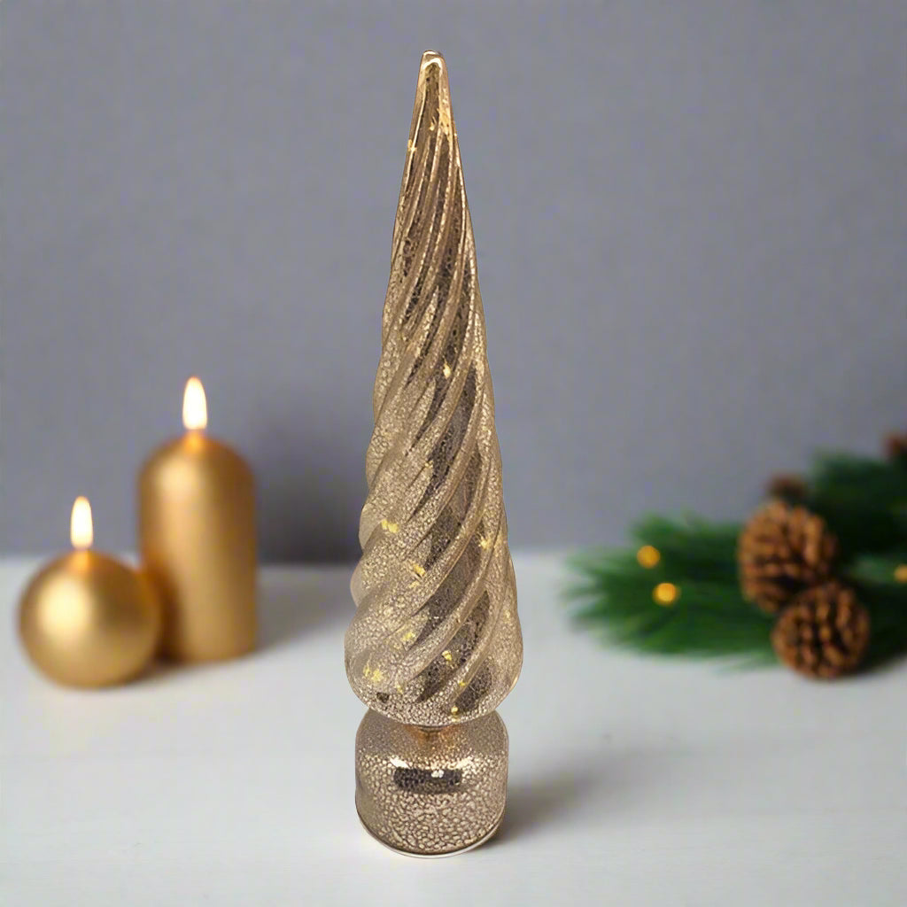 This 40cm Gold Rotating Tree features glass craftsmanship and glowing LED lights. Powered by batteries (not included), it creates a charming festive atmosphere with gentle rotation.