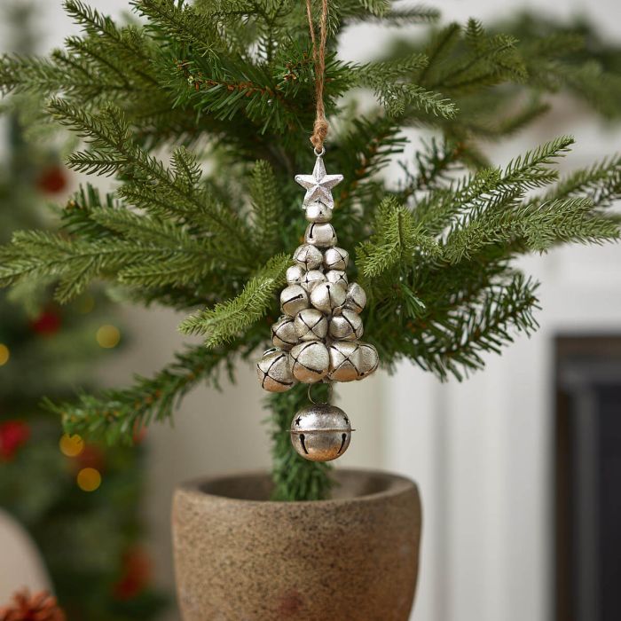 Enhance your holiday decor with this striking metal hanging ornament shaped like a Christmas tree. Crafted from multiple silver bells stacked in a classic triangular form, it creates a charming jingling sound that adds festive cheer to any space. Topped with a gleaming silver star and suspended by a rustic jute string, this decoration combines traditional elegance with a touch of farmhouse style. Perfect for hanging on your tree, mantel, or door, it brings a timeless sparkle and joyful ambiance to your celebrations year after year.