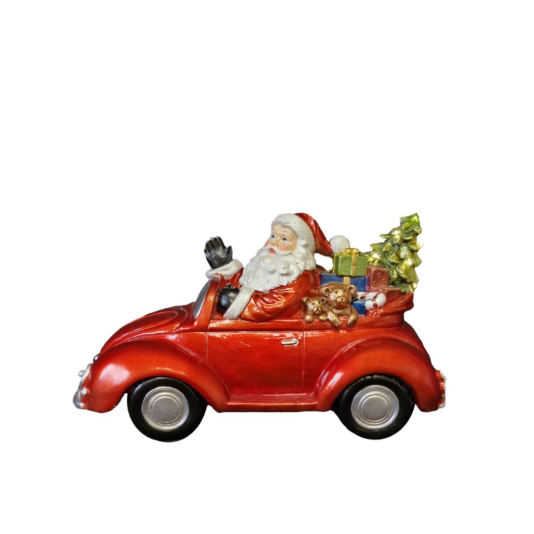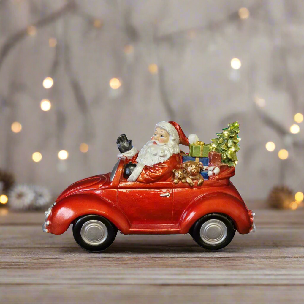Celebrate the holiday season with this charming Christmas Red Car featuring Santa Claus behind the wheel of an open-top vehicle loaded with presents. The brightly lit Christmas tree adds a festive glow, creating a heartwarming scene that captures the joy and excitement of Christmas. Perfect for mantelpieces, shelves, or holiday displays, this delightful decoration brings festive cheer and a nostalgic touch to your home. Its vibrant colours and glowing lights make it an eye-catching centre piece that spreads warmth and holiday spirit throughout your space.