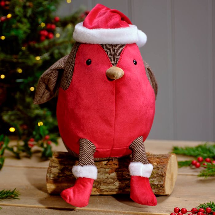AvailableThis fabric doorstop features a charming robin with a red body, brown wings and legs, black eyes, and a yellow beak, dressed in a festive red and white Santa hat. Its legs showcase a brown herringbone pattern and red boots trimmed in white, adding a cosy Christmas touch.