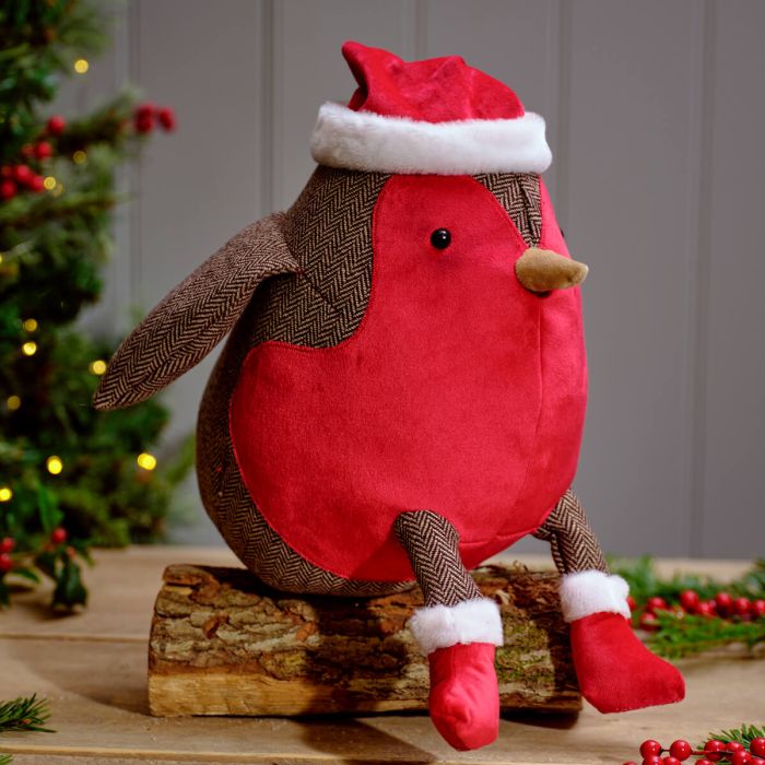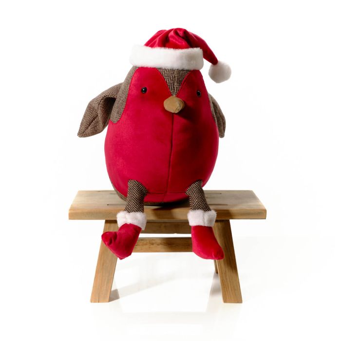 This fabric doorstop features a charming robin with a red body, brown wings and legs, black eyes, and a yellow beak, dressed in a festive red and white Santa hat. Its legs showcase a brown herringbone pattern and red boots trimmed in white, adding a cosy Christmas touch.