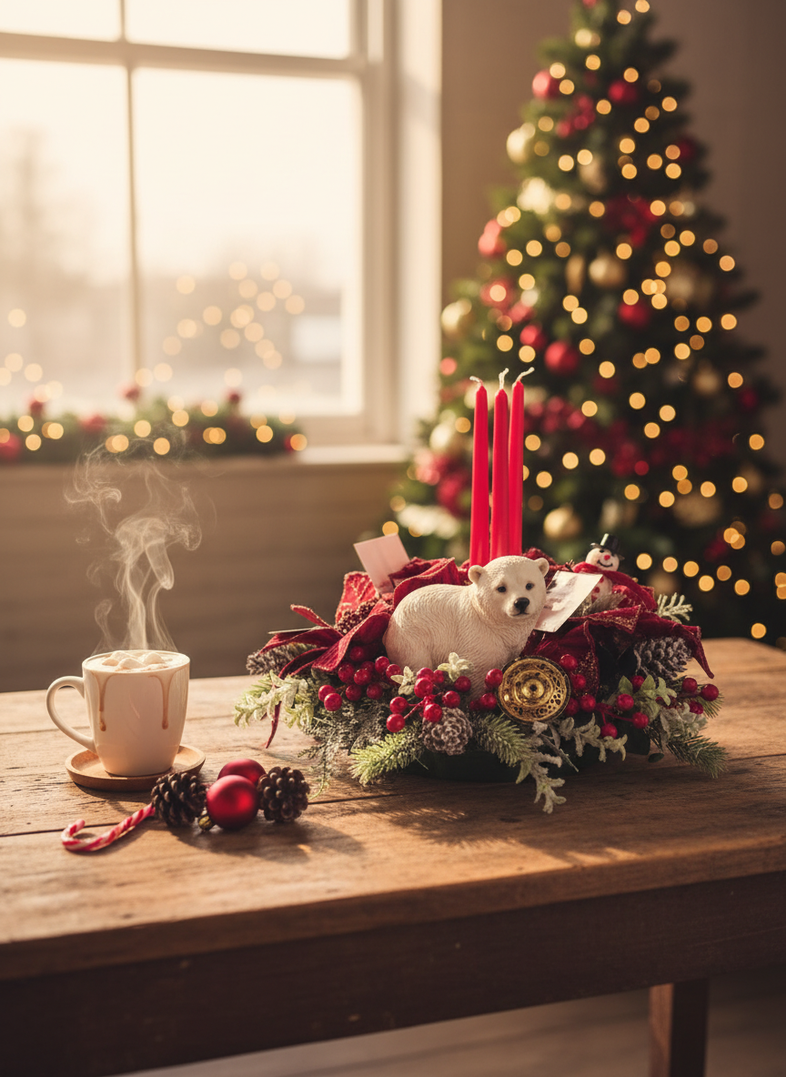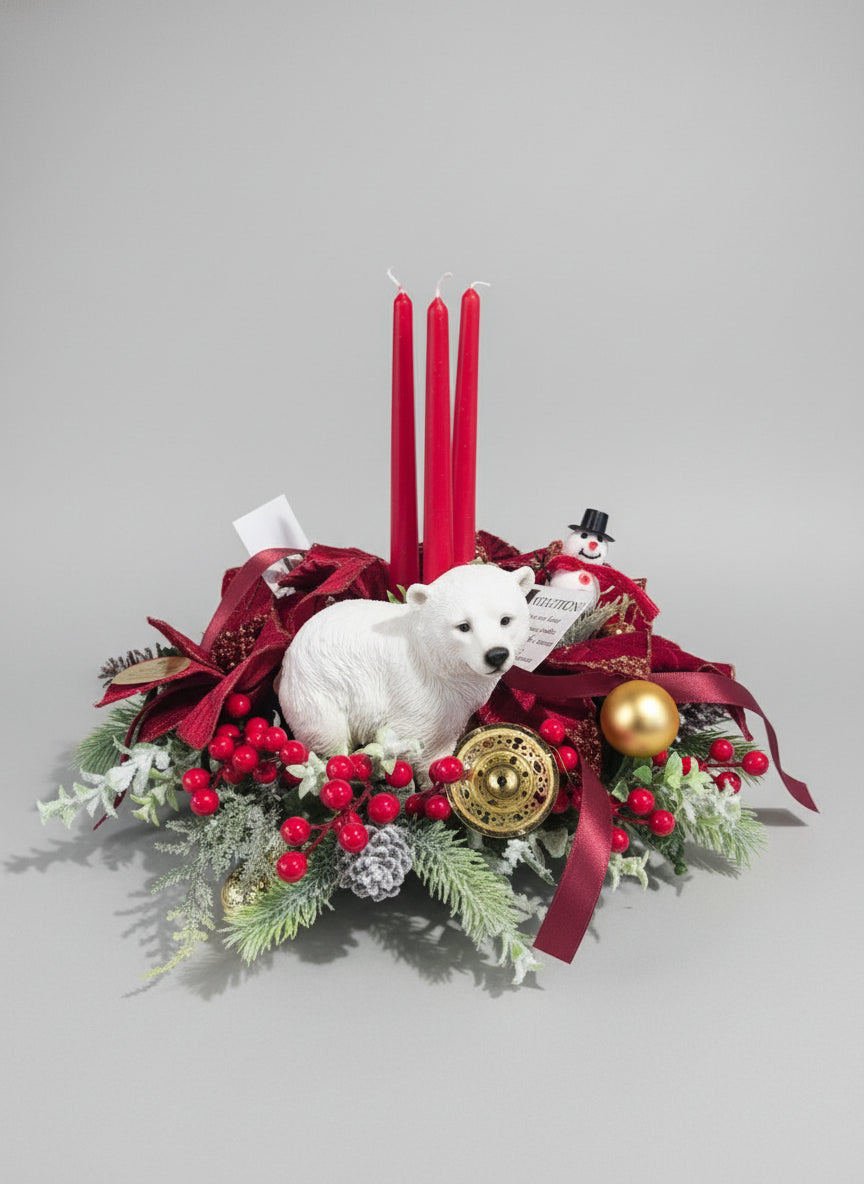 Bring festive elegance to your Christmas table with this stunning Crimson Arctic Candle Centrepiece. Featuring hand-crafted artistry, it combines velvet poinsettias, a meticulously detailed Vivid Arts Polar bear, seasonal berries, and lush Christmas foliage around three skinny red candles. The warm glow creates an inviting ambiance perfect for holiday gatherings.
