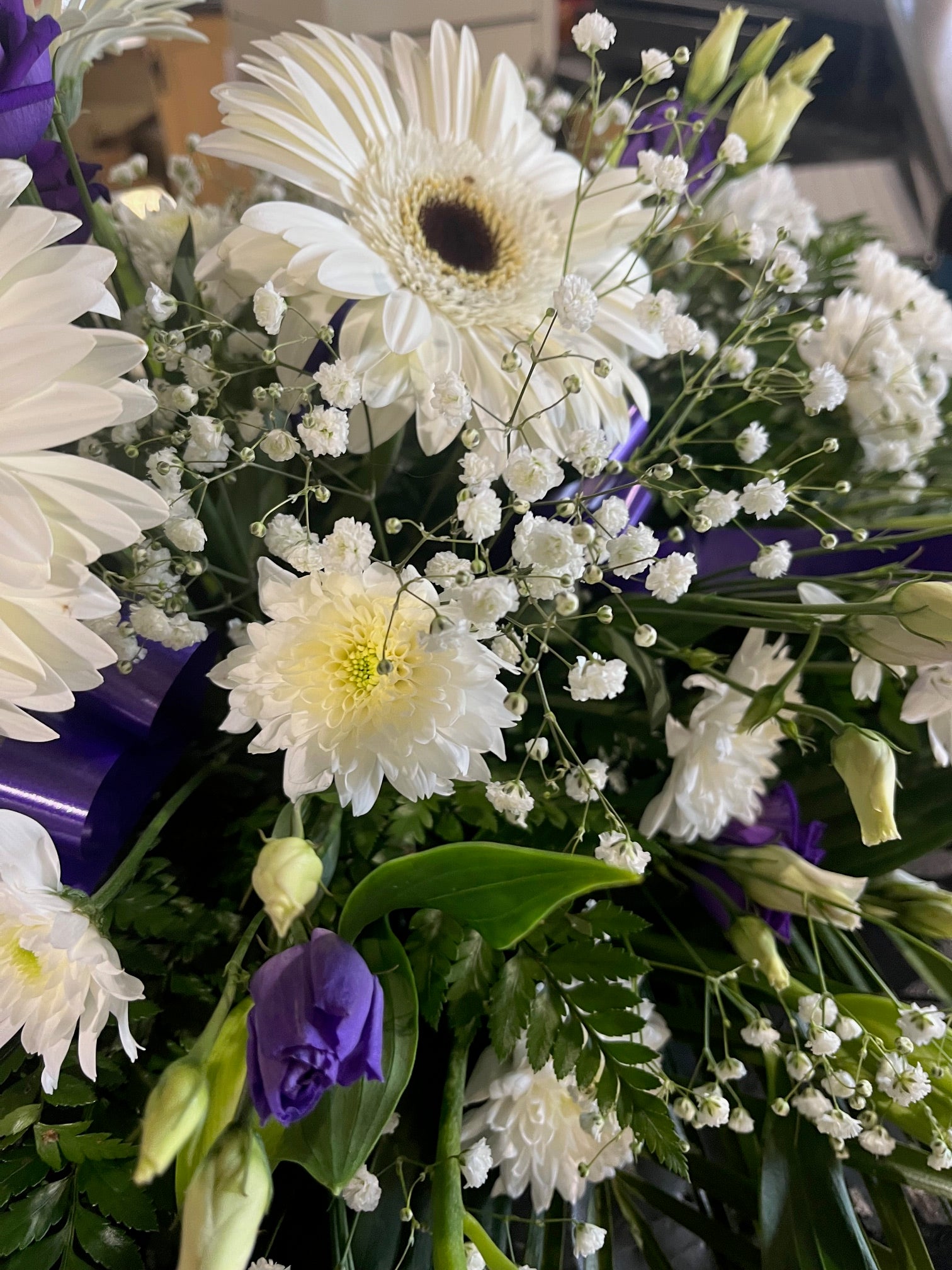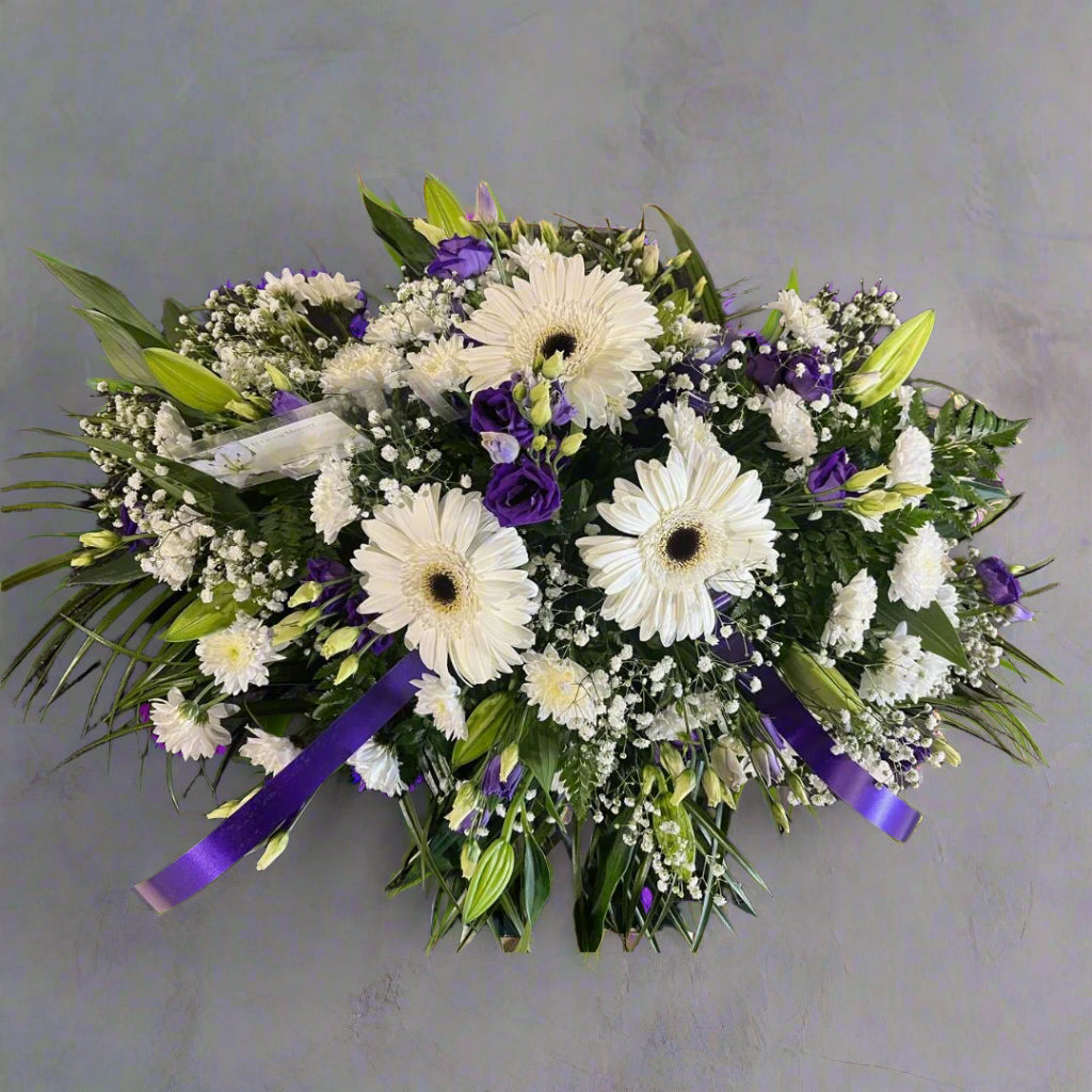 Honour your loved one's memory with our Purple and White Serenity Spray, a dignified floral tribute that conveys deep respect and peaceful remembrance. The harmonious blend of calming purple and pure white blooms creates a soothing visual symphony, offering comfort during difficult times while beautifully commemorating a life well-lived.