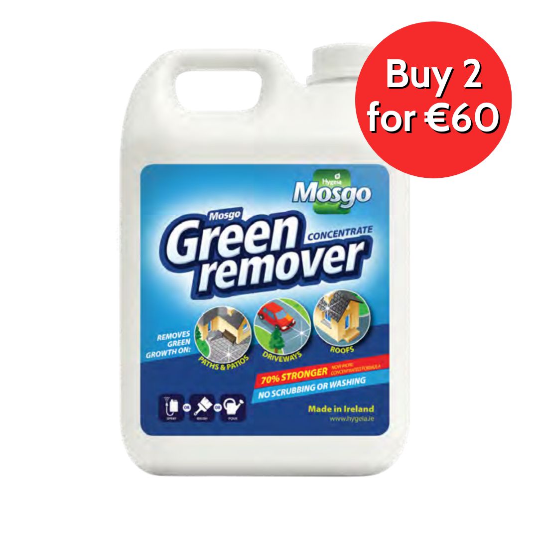 Mosgo Green Remover quickly clears moss and green algae from paths, patios, driveways, and roofs without the need for power washing. As Ireland’s leading solution, it uses less water and requires no scrubbing—simply spray, brush, or pour and let it work. Effective on tarmac, slates, and more, it restores surfaces to a fresh, clean appearance. For optimal results, brushing after application helps your driveway or patio look like new.