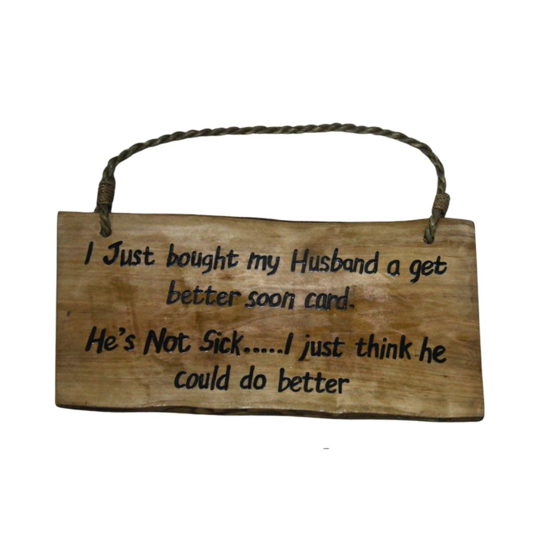 The "I just bought my Husband a get better soon card. He's Not Sick..... I just think he could do better" Coffee Wood Sign brings a fun and charming vibe to any space. Made from reclaimed coffee wood destined for disposal, each sign is uniquely crafted by hand with sustainable materials. Featuring witty and heartfelt messages, these signs make a memorable and meaningful gift. Perfect for adding a rustic touch to your home, office, or garden, they blend eco-friendly craftsmanship with playful character.