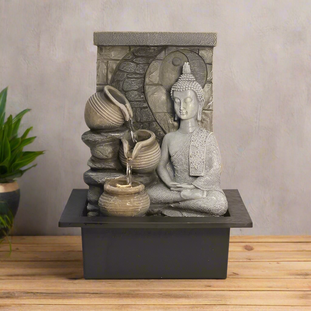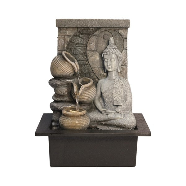 Create a tranquil atmosphere with this Three Tier Urn Buddha LED Water Feature. Featuring a serene Buddha figure next to three flowing urns, it is softly illuminated by LED lights to foster relaxation and peace. This mains-powered water feature adds a calming and harmonious accent to your home décor.