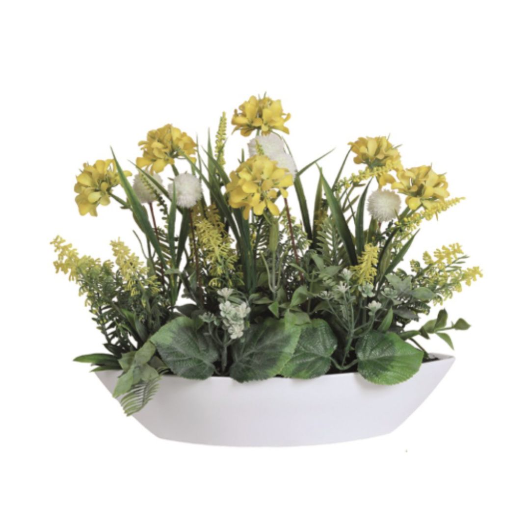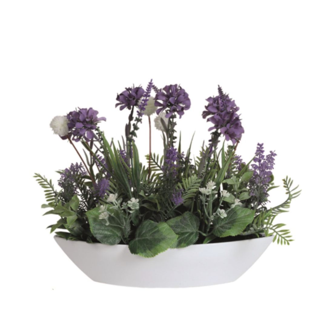 Elevate any space with these stunning flower arrangements in a 27cm white ellipse planter. Experience the vibrancy of white, purple, and yellow flowers, accentuated by green foliage, without the hassle of maintenance. Perfect for adding a touch of nature to your home or office.