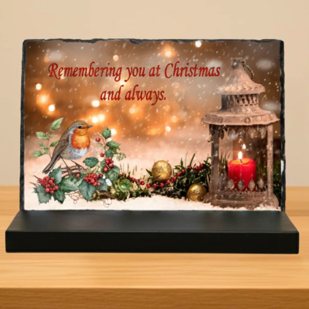 A touching tribute to a cherished memory, this slate grave plaque features a delicate robin design—a symbol of hope and comfort during the festive season. The engraved message "remembering you at Christmas and always" offers a heartfelt way to honour loved ones year-round. Crafted from durable slate and mounted on a sturdy stand, it's designed to withstand the Irish weather while providing a peaceful focal point in any garden or memorial space. A meaningful keepsake that celebrates the enduring bond you share.