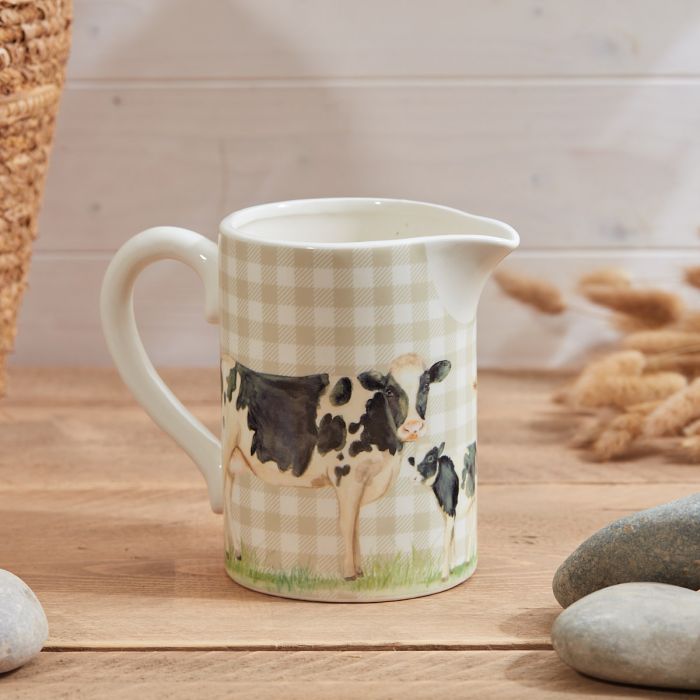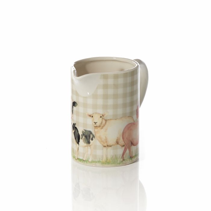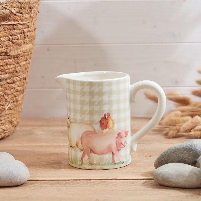 AvailableLooking for the perfect farmhouse accessory to add charm and character to your home? Look no further than our Farm Animal Jug in taupe gingham ceramic, featuring adorable sheep, pigs, and cows. This beautifully crafted piece will bring a touch of rustic elegance to any room, making it a must-have for any animal lover or country enthusiast.