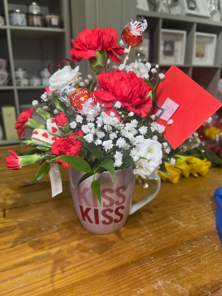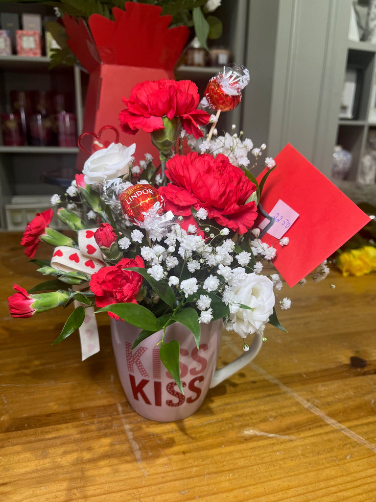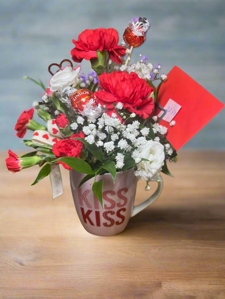 Surprise your loved one with our Kiss Kiss Bouquet in a Mug! This adorable mug is filled with beautiful flowers and delicious chocolates, making it the perfect gift for Valentine's Day. Show your love and make their day with this romantic and thoughtful present.