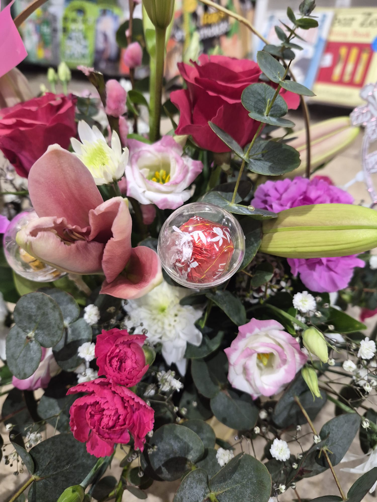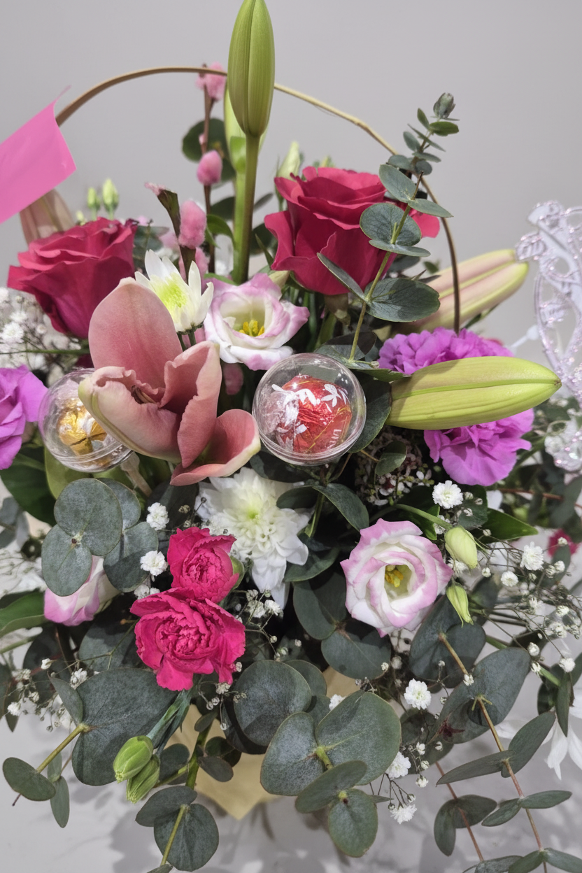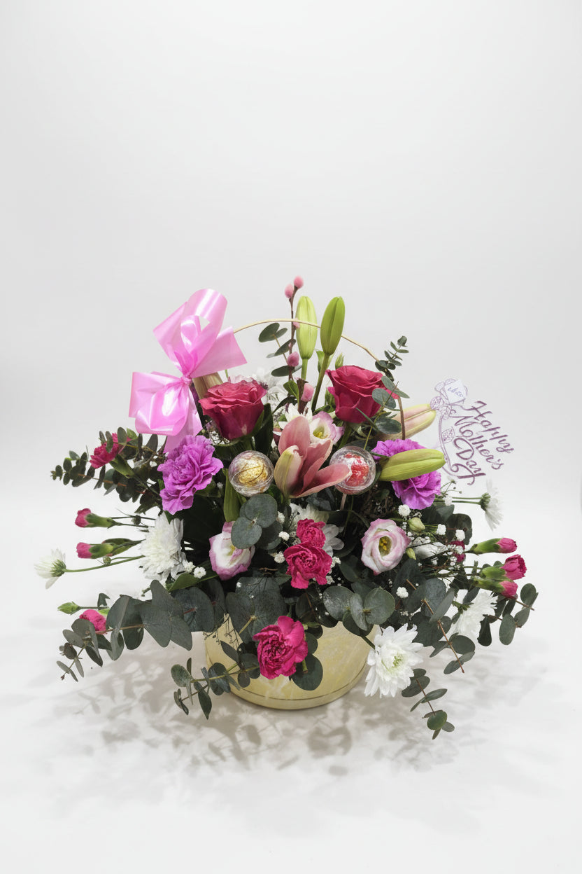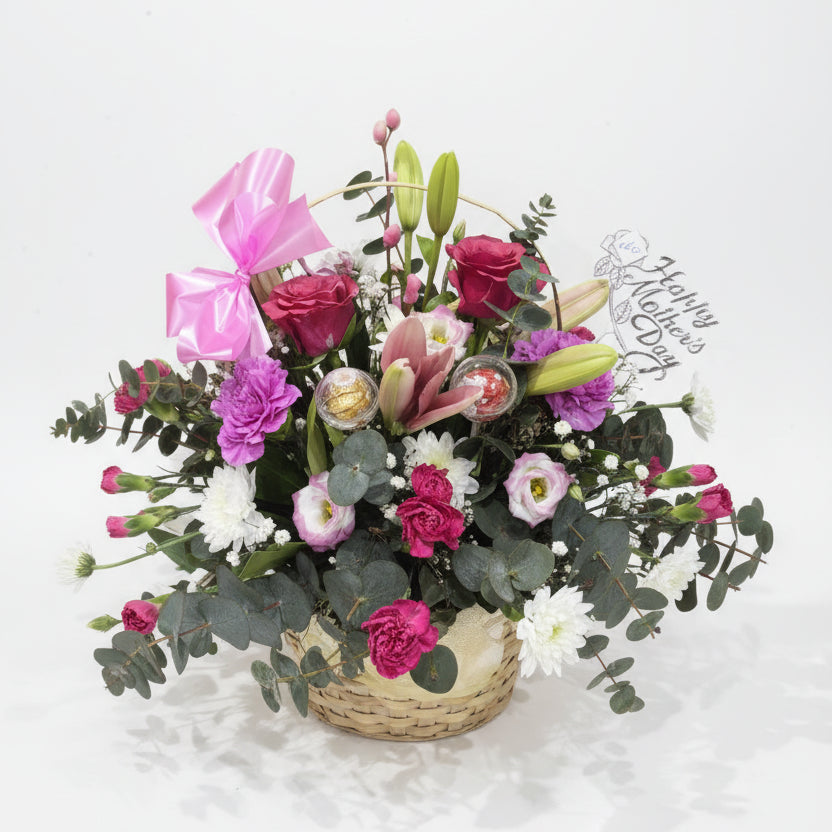 Celebrate Mother's Day with a thoughtfully curated gift that combines the natural beauty of fresh flowers with indulgent chocolates. This elegant basket arrangement features vibrant blooms hand-selected to brighten any room, complete with premium chocolates for a touch of sweetness. Perfect for expressing gratitude and affection, this gift delivers both visual charm and delicious treats in one stunning presentation. An ideal choice for the special mother in your life.