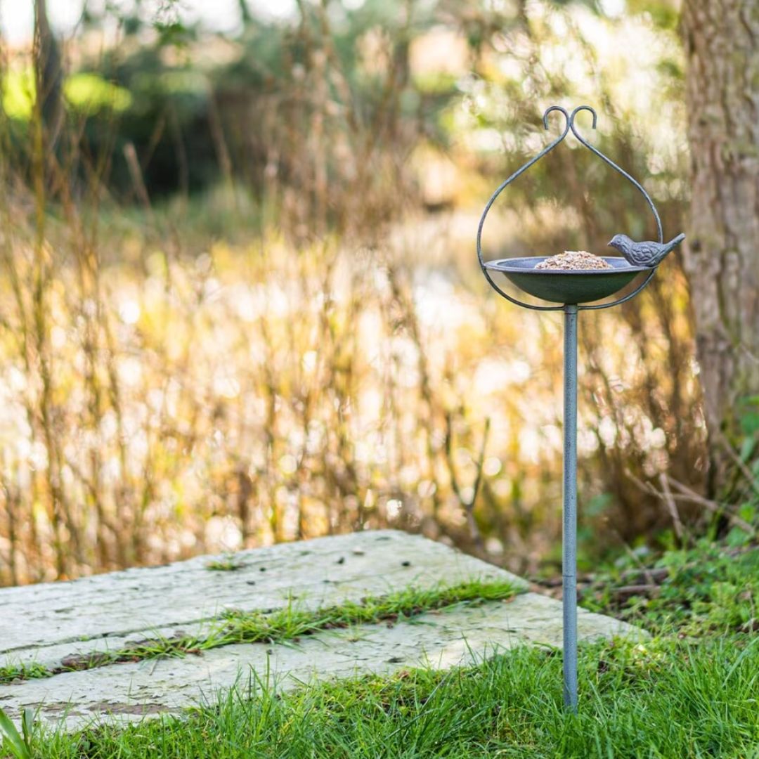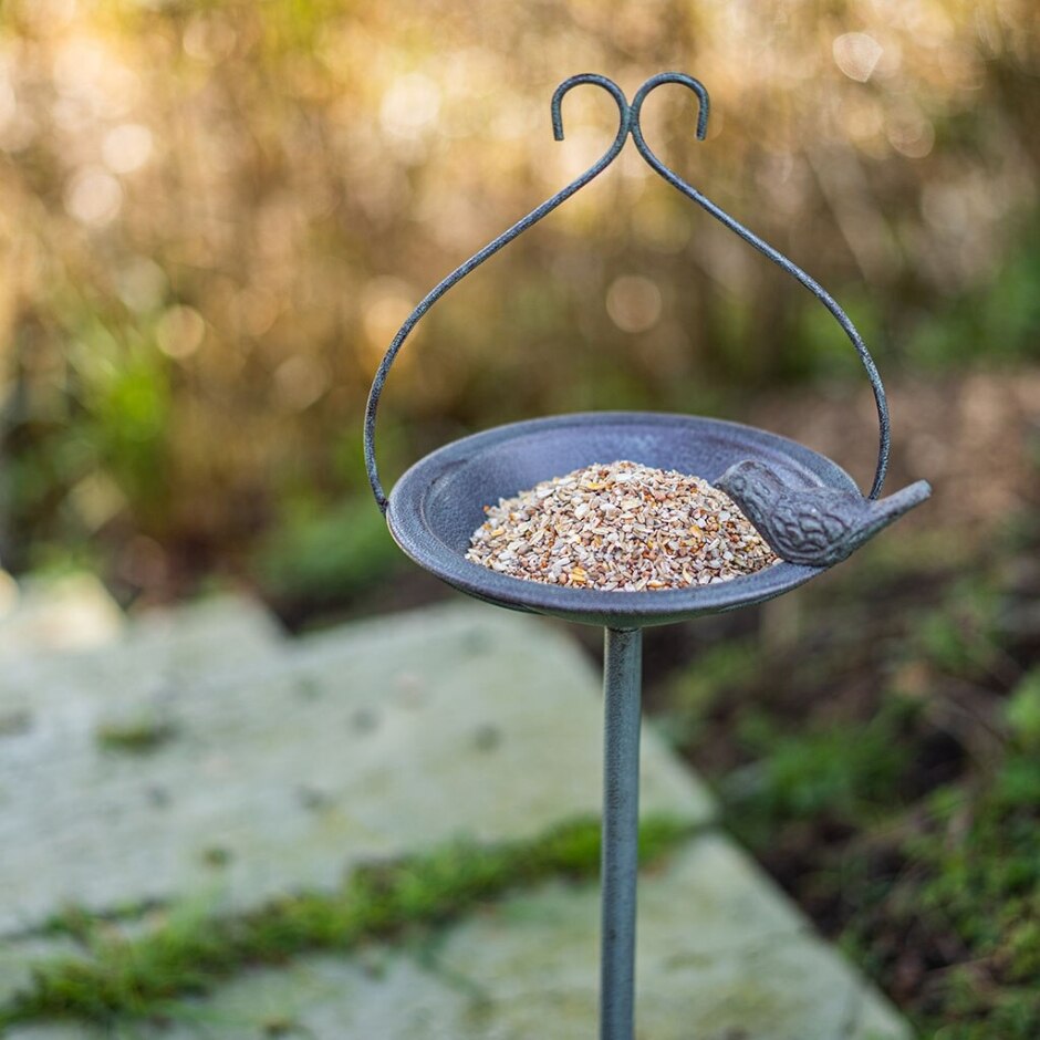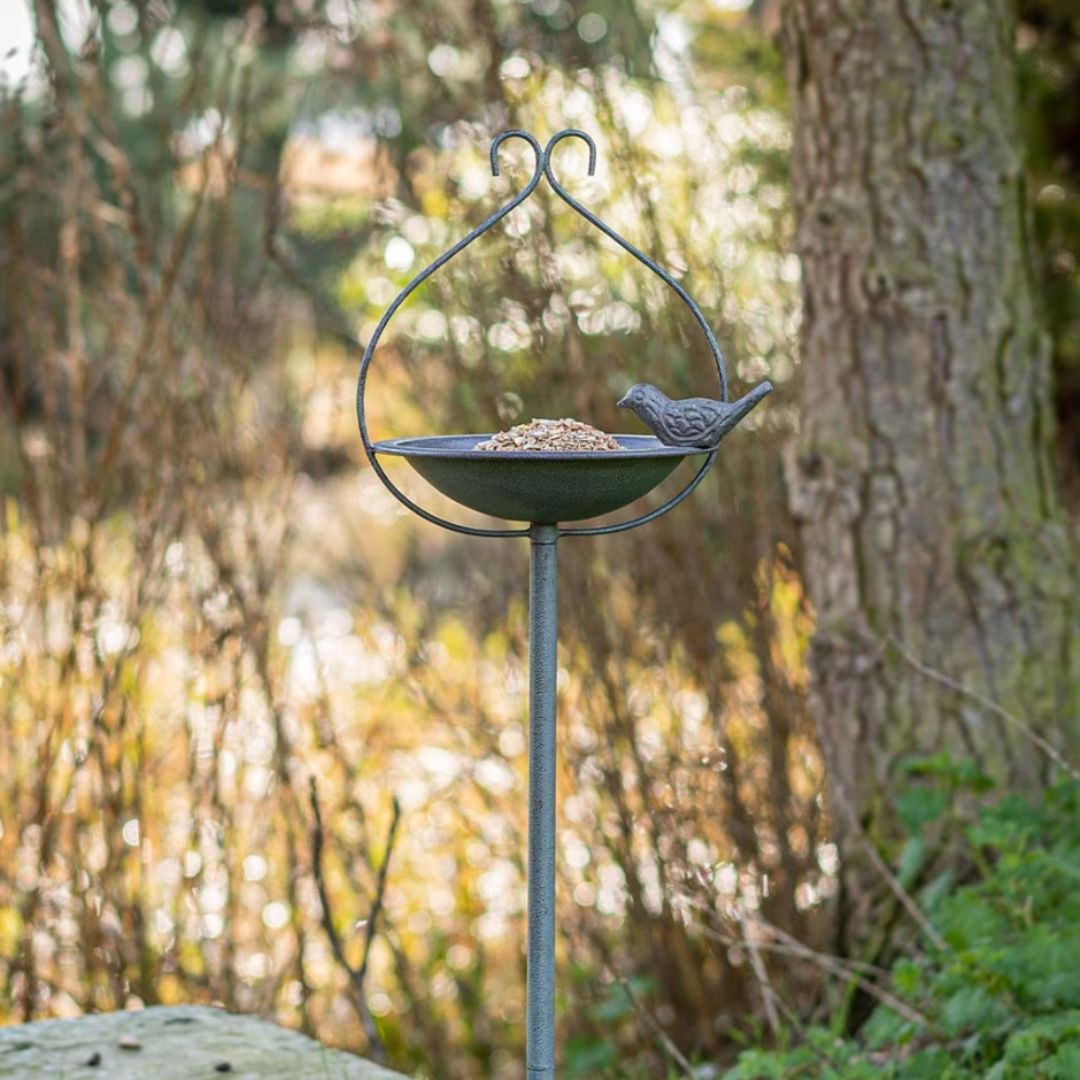 It is made from hard wearing metal, a sturdy yet stylish design providing birds with the ideal feeding place. This feeder includes a strong and stable ground spike along with attached hooks for bird feeders.