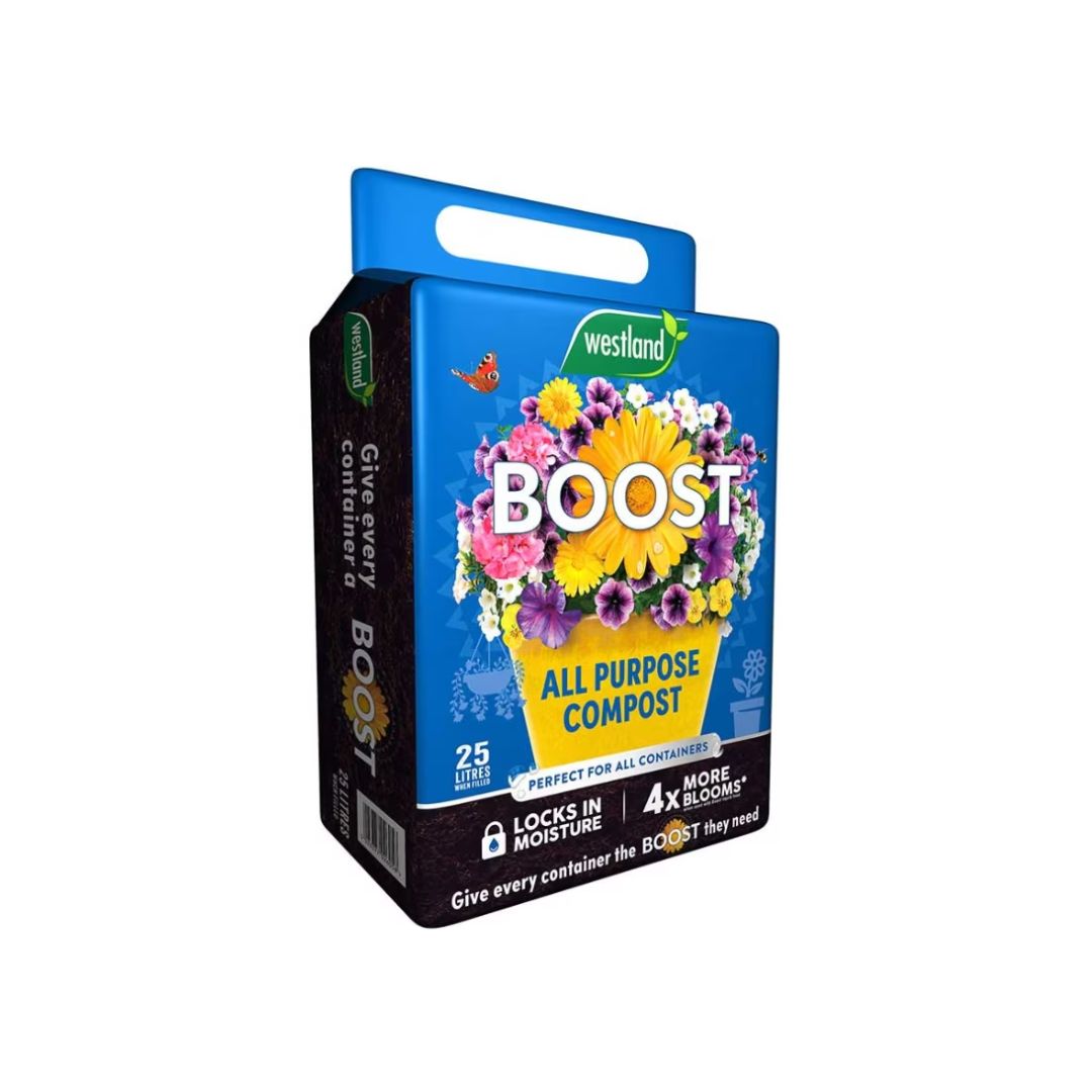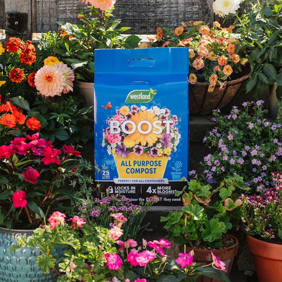 Achieve vibrant and long-lasting blooms with Westland Boost All Purpose Compost. Its Boost Container & Basket Planting Mix, featuring moisture lock technology, locks in water to prevent drying out. Perfect for container and basket plants, this 25L mini bale will keep your plants healthy and thriving. Try it now!